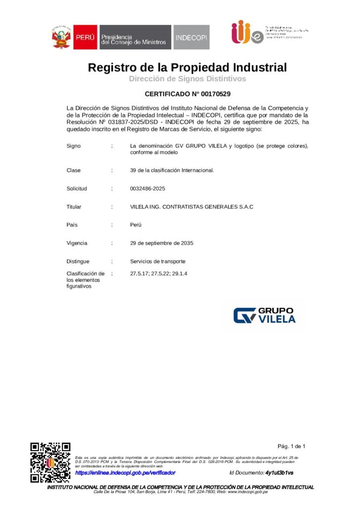 Grupo Vilela es una marca registrada ante INDECOPI bajo el Certificado N° 00170529, clase 39 (Servicios de transporte), con vigencia hasta el 29 de septiembre de 2035.